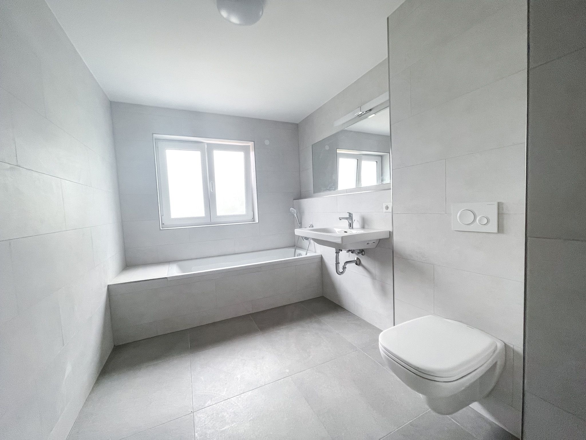 *Badezimmer* Bodengleich Dusche, geräumige Badewanne, Waschbecken, großer Spiegel und hochwertige Sanitärkeramik